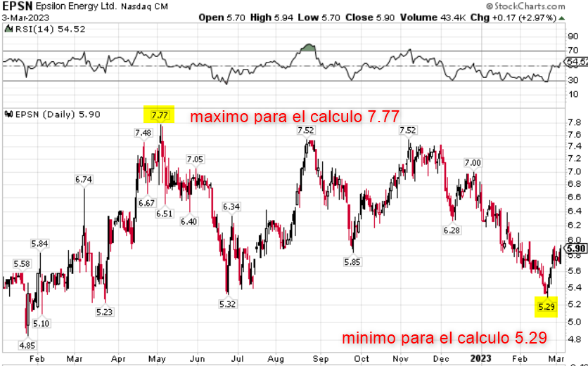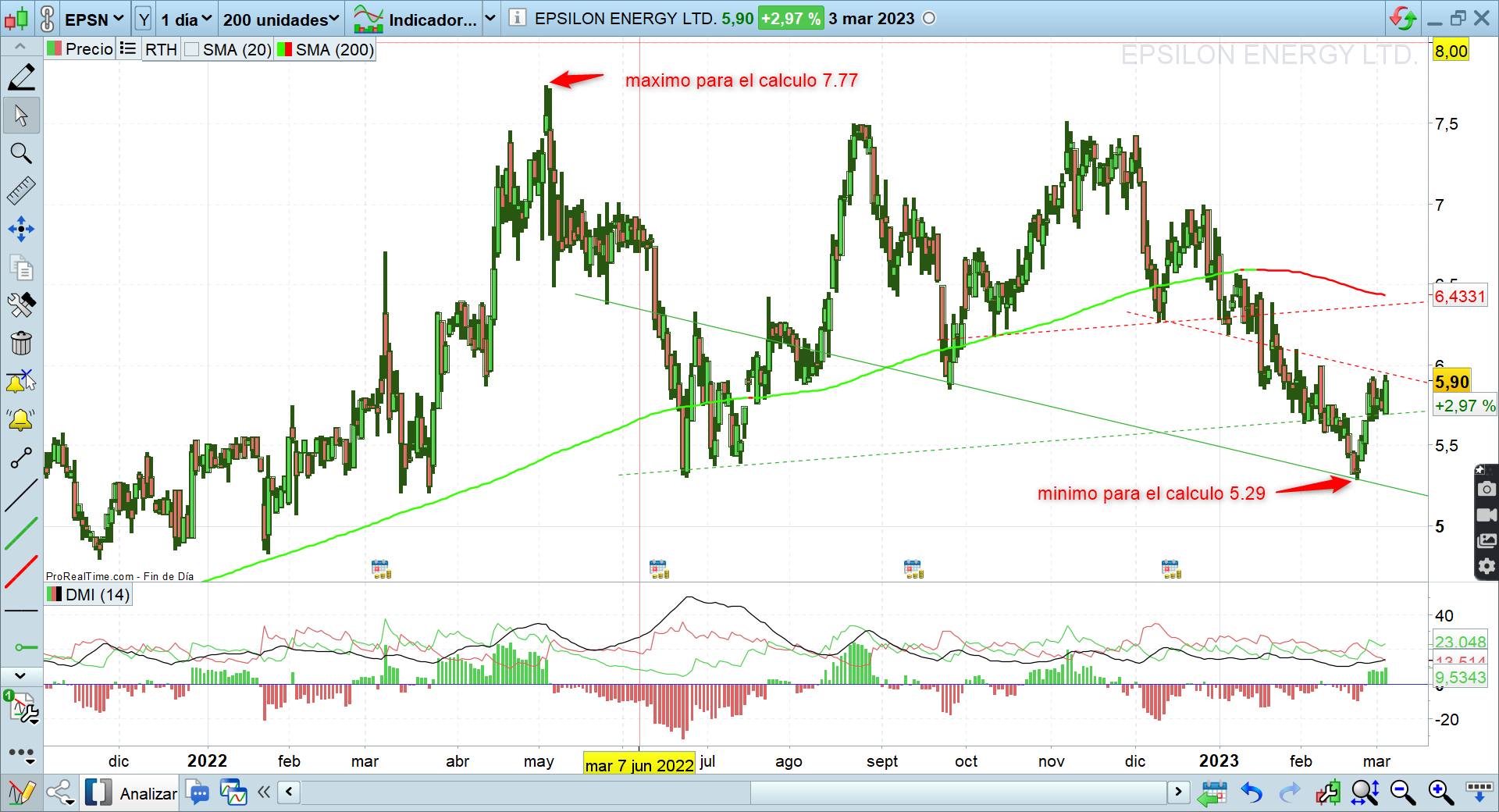 Para el ticker EPSN, como se aprecia en la imagen 1, se obtiene un %pullback de 95,8 que según la imagen 2 es el 31,65. En este caso los datos para el calculo deben ser para HH el 7,77 y para LL 5,29 como se aprecia en la imagen 3. Desconozco que datos ha tomado el proscreener para obtener el %pullback de 98,8.