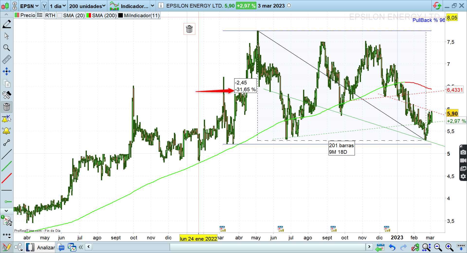 El indicador marca el resultado que figura en el proscreener (imagen 1 ), en cambio no marca el porcentaje de retroceso correcto que a mí me interesa que esta calculado con la regla del propio programa y qué es el treinta y uno sesenta y cinco por ciento como señalo con la flecha roja en la imagen 6.