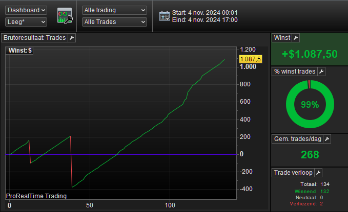 What you see below is a test run of one day. Statistic contains all (as far as I can tell) so nothing wrong there. What we sadly don’t see incorporated in the Commission. Yea, that one again. Well, it is sort of easy to see for the one system which ran there : 134 times 4.40 (2.20 per side as it still was the beginning of November – today it is 2.25). So instead of 1K profit it was 5K loss.