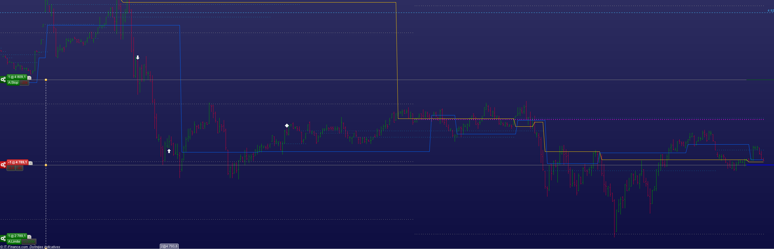 Une position vendeuse à 4789,1 pour le pro-order, et rien pour le backtest (flèches blanches).