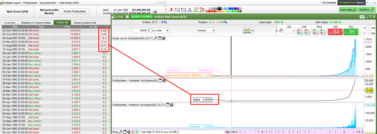 The strategy simply buys the stake size in accumulating positions and then sells them all in one go at market. There is no partial closing of positions.