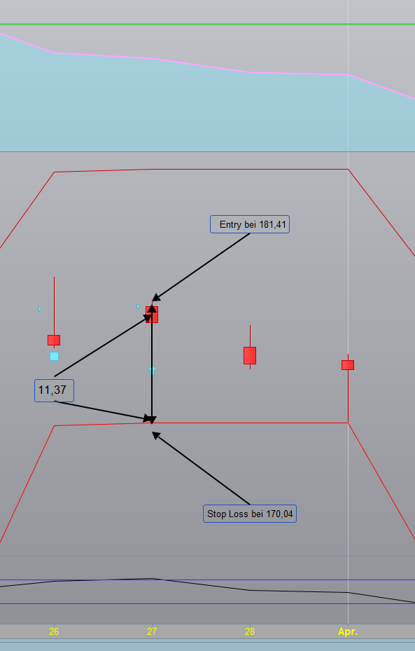Beispiel: Haben wir die Aktie für 200 gekauft und der SL liegt beim Preis von 190, dann haben wir ein Risiko von 10 pro Aktie und können bei 300 Risiko, 30 Aktien kaufen.