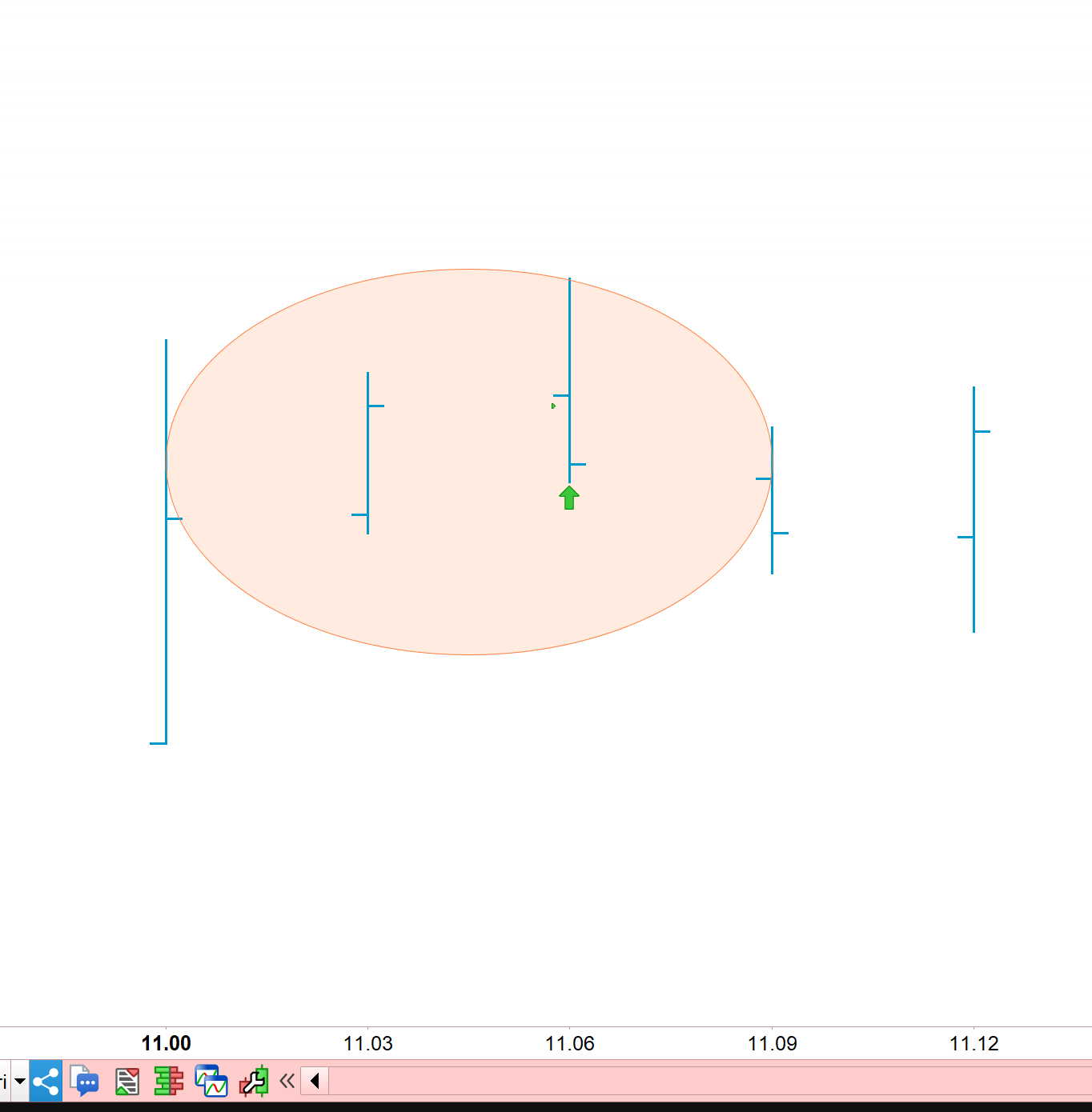 Come si vede, il range della candela successiva (freccia verde dove entra proOrder) è molto esteso: sia che il prezzo sia andato prima verso l’alto e poi la candela ha chiuso al ribasso o prima verso il basso, poi verso l’alto e poi nuovamente in basso dove ha chiuso, deve per forza ripassare sul close.
