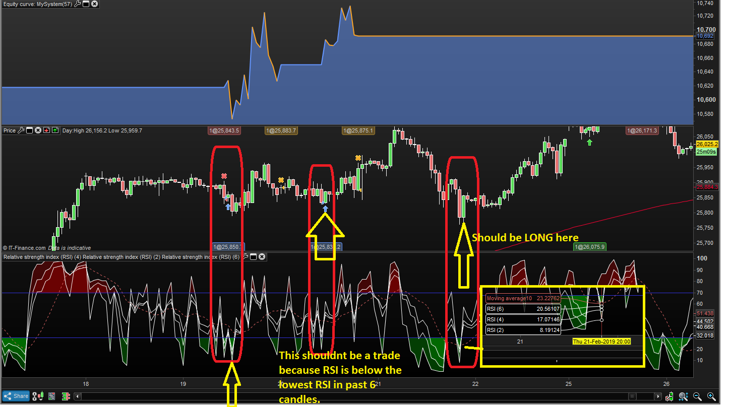 edit: first yellow arrow is pointing to the wrong rsi dip but same goes for the actual dip. Its below the lowest low of last 6 rsi and my condition is that the current RSI is ABOVE the last 6 rsi lowest lows. Not sure if its buggy stuff or just me thats thinking wrong somehow.