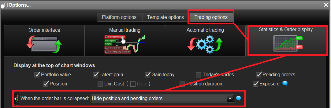 You may also configure via this window the information you wish to display at the top of the chart windows such as Portfolio value, Latent gain, Gain today, Pending order, Positions, Exposure etc…