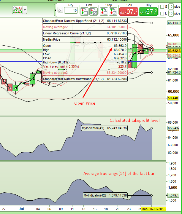 In this image the bottom indicator is showing AVERAGETRUERANGE[14](close[1]) which is the value a strategy would get at the close of a bar when it makes its decision. The OPEN of the current bar is the price you would open your trade at. Added together we get your take profit price which is shown in the top indicator which is my code.