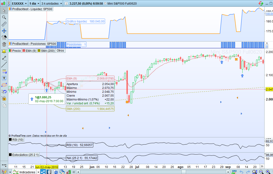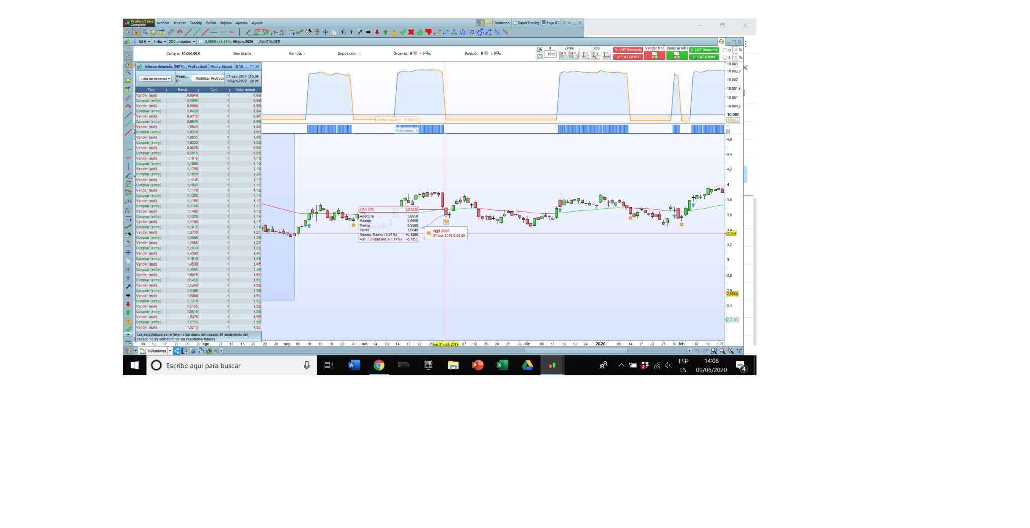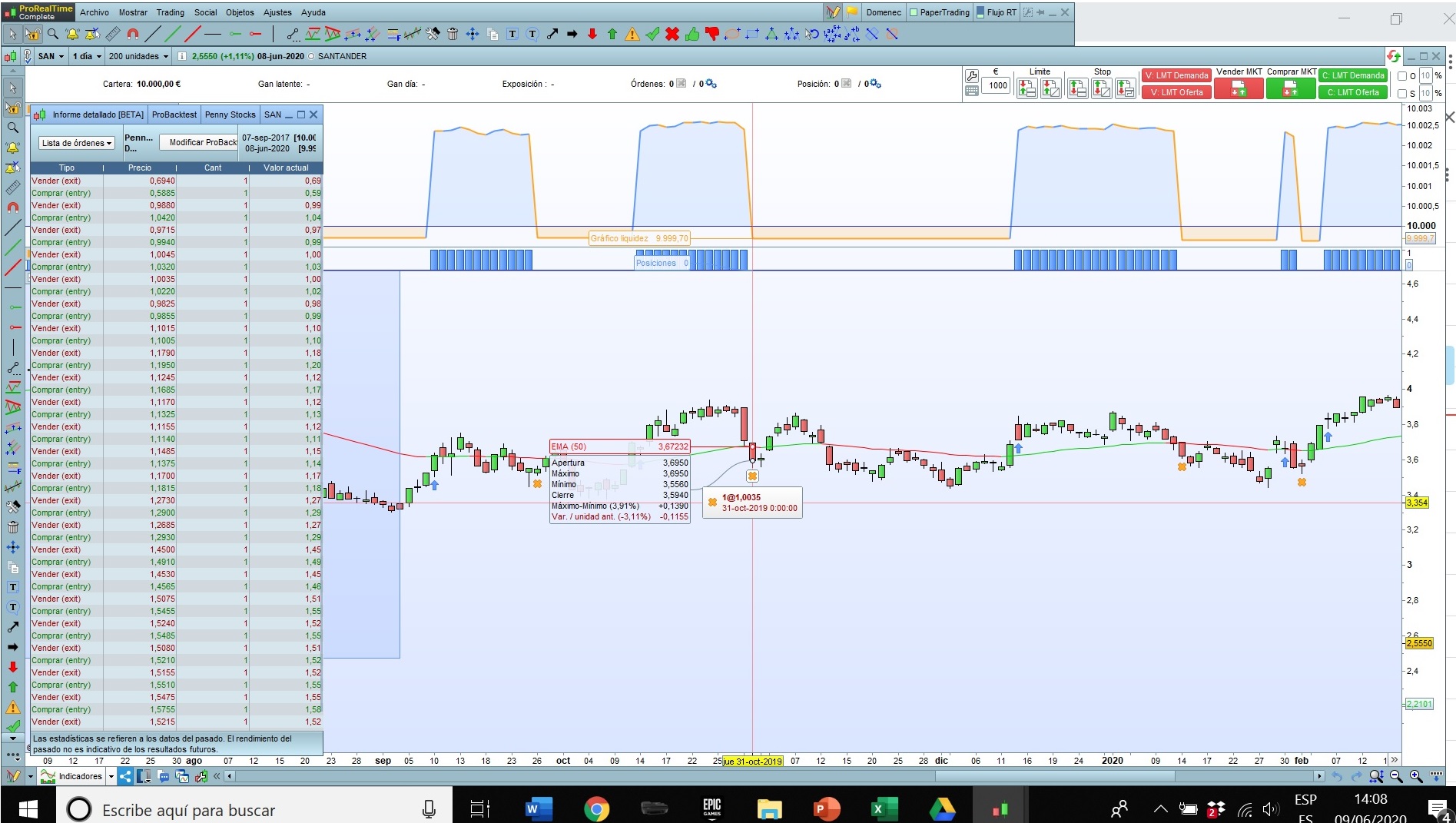 Ocurre en Acciones y en varios marcos de tiempo, tanto diario como semanal. Te adjunto por un lado captura de pantalla de la versión que tengo instalada y por otro un pantallazo de ejecución del sistema Penny Stocks en la acción de Banco Santander, como verás en la lista de órdenes los precios son erróneos (además no me aparecen las fechas de las órdenes) y en el grafico de liquidez puedes ver los saltos que da al no aplicar correctamente los precios de entrada y salida de la operación.