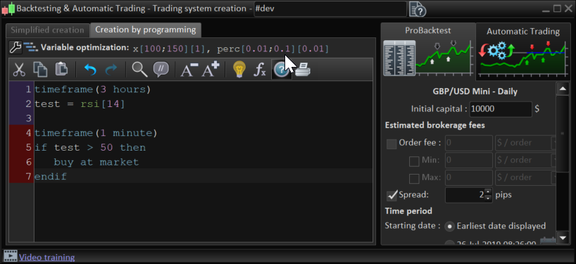 Ces lignes sont là uniquement pour permettre au backtest de fonctionner, car sans ce type d’instruction d’achat ou de vente, il refusera de se lancer. Mais tu remarqueras que la variable “a” ne sera jamais supérieure à 0, donc aucun ordre ne sera jamais lancé !