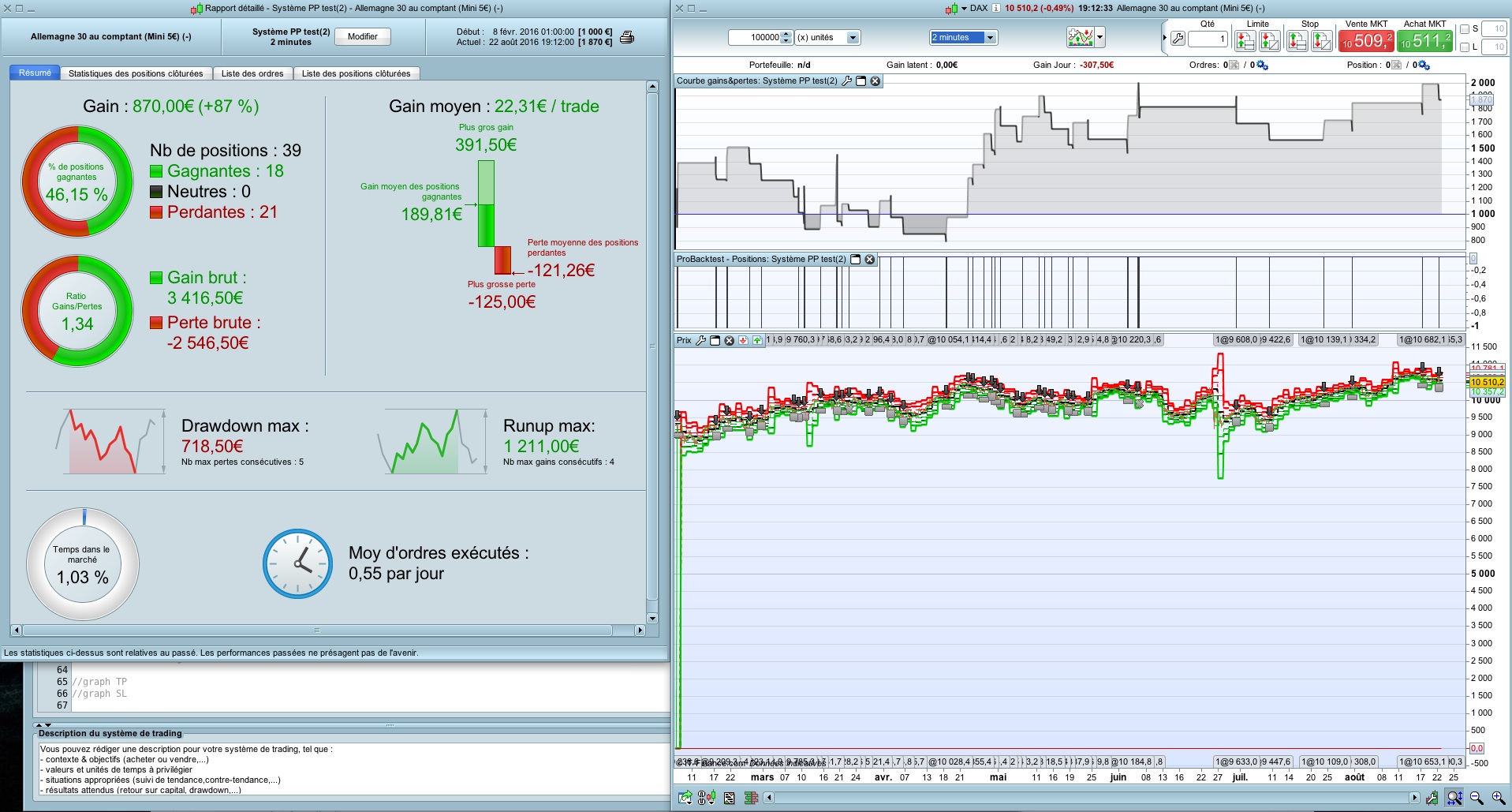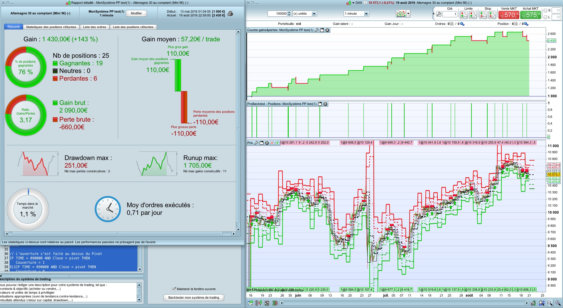 Je suis sur le DAX, en UT 1 minute pour plus de fiabilité du backtest (1 seul trade possède le sl et le tp sur la même bougie pour ce BT), par contre ça manque d’historique …