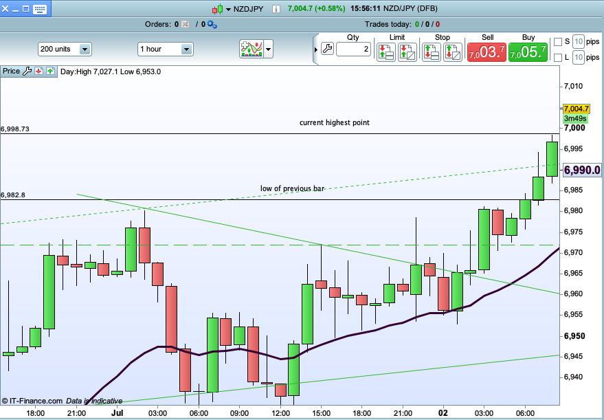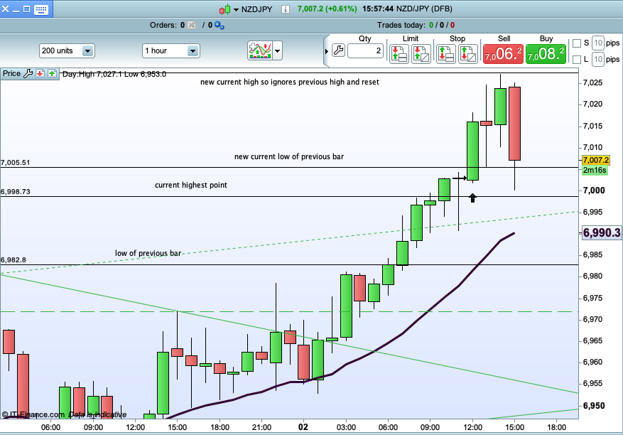 Thanks GRAHAL, good idea I’ve now uploaded screen shots – first shows initial set up it takes the highest new bar SINCE code activated. and would trigger a sell when the low of the previous bar is hit . If a new higher bar is achieved it ignores the previous and resets with this new bar and takes the previous bar low as the trigger.