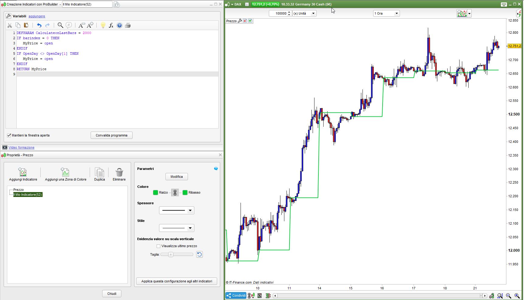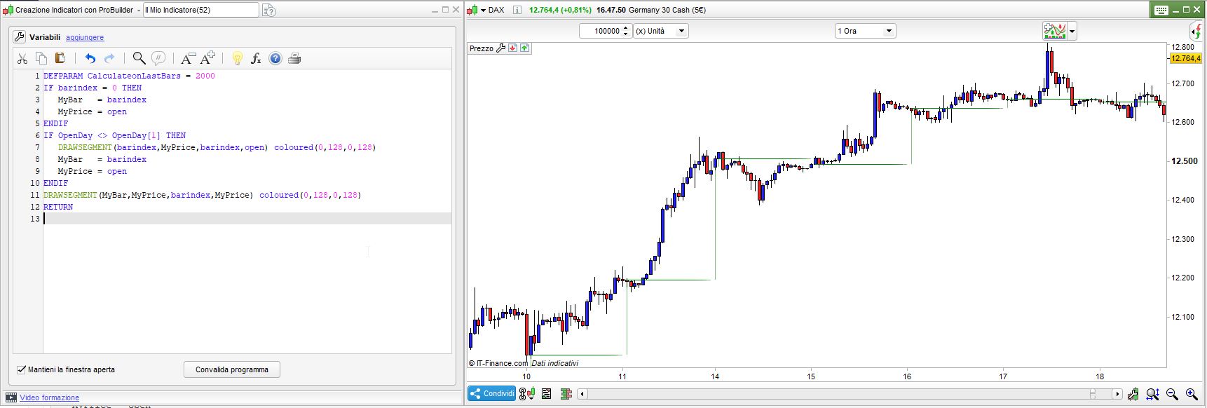 Salve, vorrei un indicatore che collegasse le aperture del dax tra una seduta all’altra (usando l’apertura delle 1.00). Come in figura. Grazie