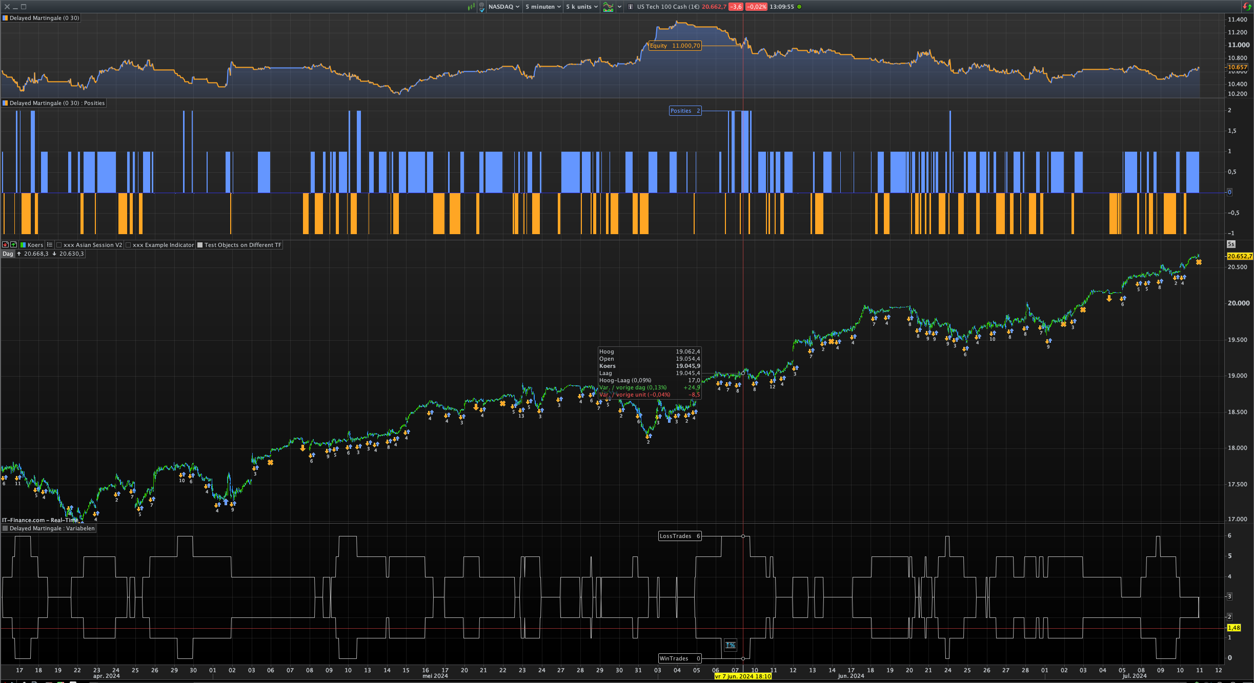 Exemple : les 5 dernières positions acheteuses et vendeuses confonduent lors de la cassure du supertrend en clôture avec un tp et un sl défini auraient donné une perte (ces positions n’ayant pas été prise en réalité). J’aimerais que sur le sixième signal par exemple, il y ai une entrée en position. Et que si jamais cette position est perdante, sur la suivante, on est une martingale par exemple. Et qui dès que la position est gagnante, on attend de nouveau un cycle de 5 signaux perdant avant d’entrer en position sur le sixième.