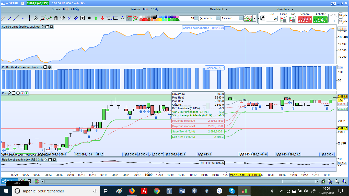 Alors j’ai une question: normalement dans les backtests, le prix d’achat retenu est le “close” de la bougie qui vient de se fermer au moment de la prise de position. Mais, comme vous pouvez le constater sur l’image jointe, depuis que j’ai activé l’option “multitimeframe” sur ma plateforme ProRealTime Complete, le prix d’achat retenu dans les backtests est désormais le “open” de la bougie qui vient de s’ouvrir … (pour ce backtest j’ai mis un spread de 0 alors que c’est 0.6; on voit bien sur l’image que le “close” de la bougie précédente est nettement inférieur à 2893.9, plus précisément c’était 2893.6).