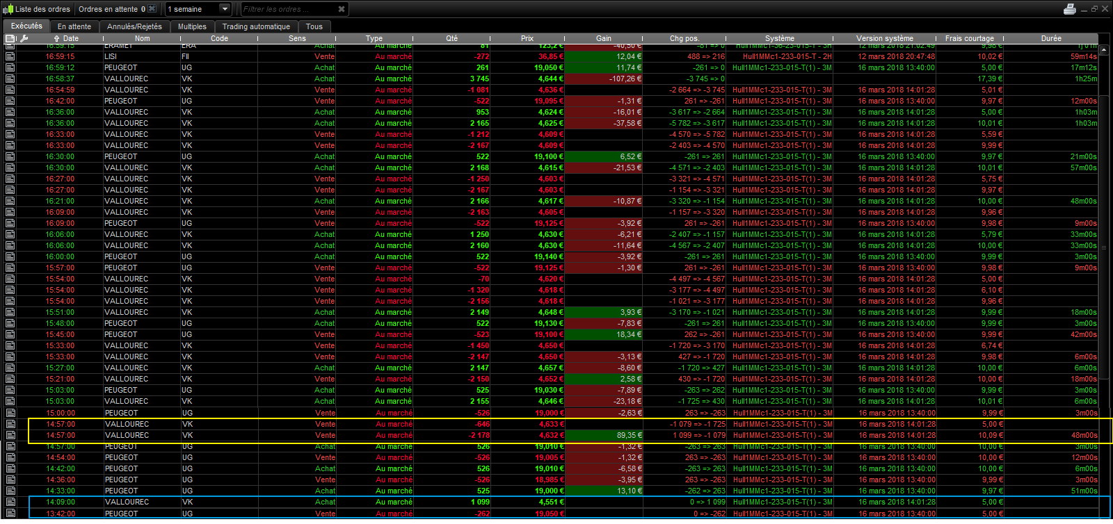 Avec peugeot aucun pb les ordres se sont bien exécutés et le nombre d’actions tradées est toujours correct. Cependant avec Vallourec souvent le le nombre d’actions tradées ne correspond pas au système (qui aurait du etre n=5000/close) voir carré jaune notamment. En effet la prise de position doit toujours être egale à +/- 5000E. En backtest il n’y avait aucun pb.