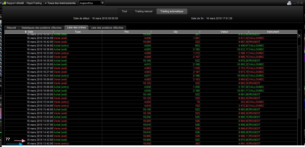 Aujourd’hui je teste Orange et Vallourec toujours, et Vallourec montre le même pb alors qu’Orange réagit très bien comme Peugeot le 16 aprem. Ce que je n’arrive pas à comprendre c’est cette différence entre actions et si c’est un pb du uniquement au papertrading ou si ca produira aussi en réel….