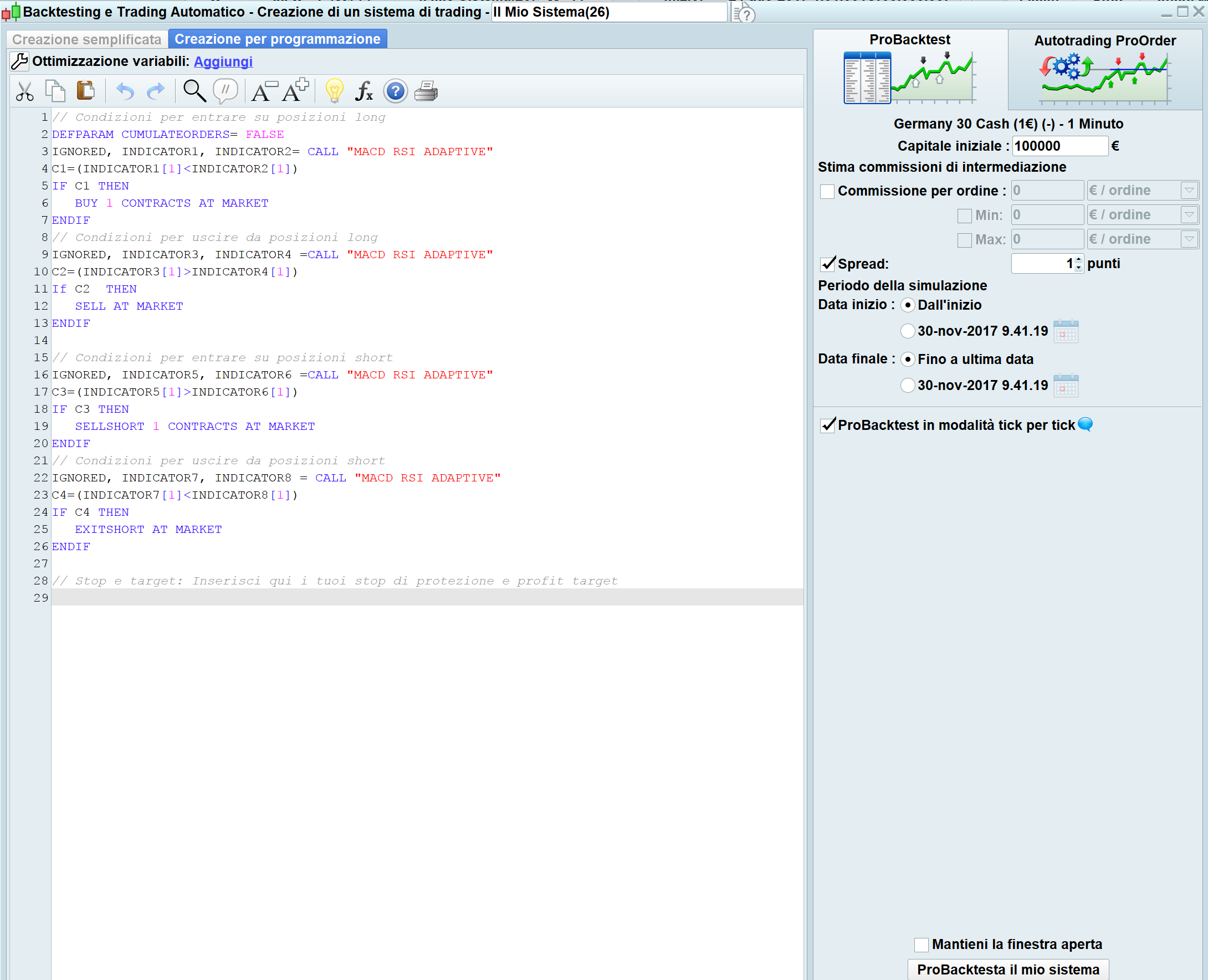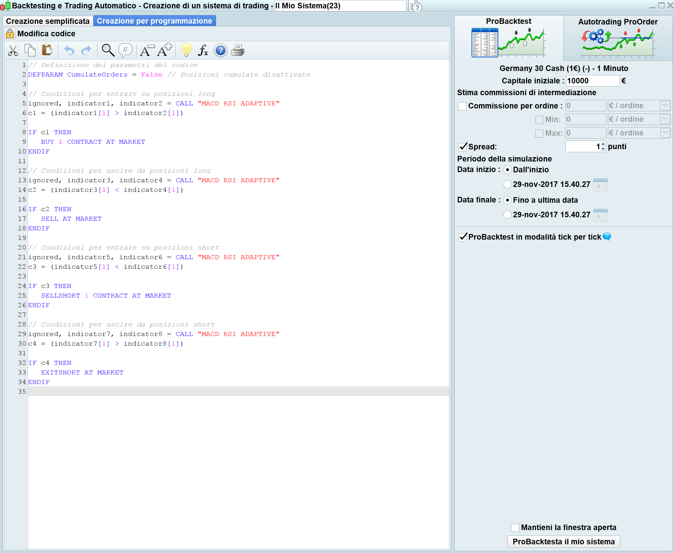 Buongiorno a tutti, avrei bisogno di un chiarimento sui probacktest, c’è qualcosa che proprio no riesco a chiarire. Mi spiego meglio: ipotizziamo che definisca due condizioni, condizione 1 per entrare a mercato e condizione 2 per uscire dal mercato, avvio il probacktest e verifico che il risultato dello stesso è negativo Per esempio, ipotizziamo che la condizione 1 per entrare a mercato corrisponda a valore di mercato 10 e la condizione 2 per uscire dal mercato corrisponda a valore 4, concludendo il probacktest con un risultato di -6 (condizione 1 – condizione 2, ovvero 10-4), allora mi dico ok, anziché comprare alla condizione 1 e vendere alla condizione 2, farò il contrario, venderò alla condizione 2 (valore 4) per comprare alla condizione 1 (valore 10); mi aspetto quindi un risultato positivo ma invece il risultato è altrettanto negativo…come è possibile??? Grazie anticipatamente per eventuali risposte