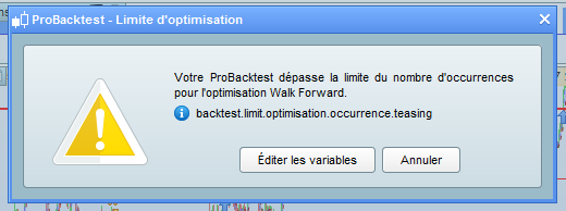 lorsque j’essaye de backtester son code, une fenêtre m’alerte en me disant que “mon Probacktest dépasse le nombre d’occurrences pour l’optimisation du walkforward”.