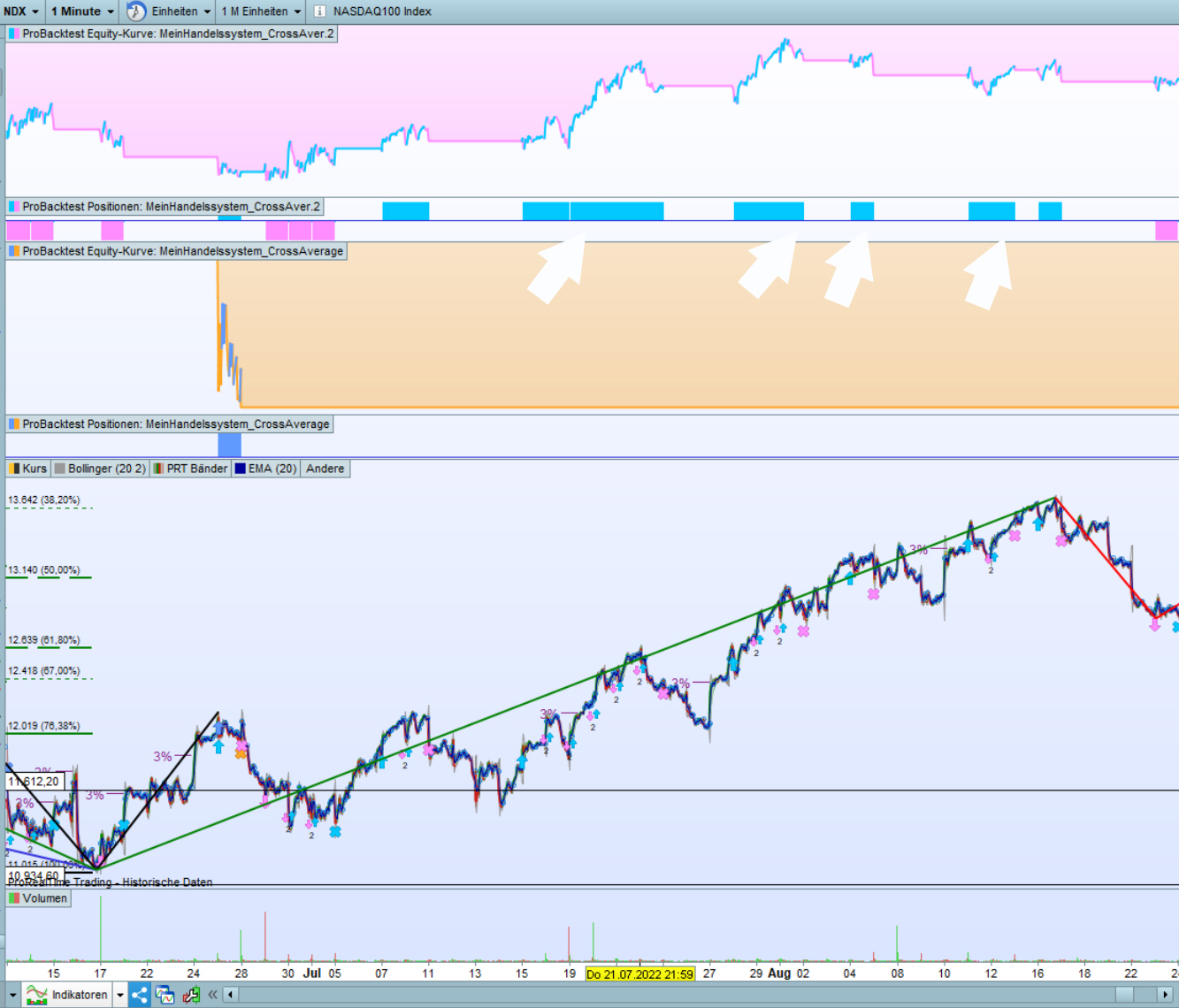 In ProBacktest CrossAver.2 (blau rosa), wird der Trade eingegangen. (Dies ist die Variante, wo ich Ihren Code in ProBacktest direkt einkopiert habe.) Hier findet aber weder ein regelkonformer Ausstieg statt, noch sind die folgenden Trades, im Bild mit weißen Pfeilen Markiert, erklärbar. Der Kurs ist weit über dem SMA20 im Tageschart.