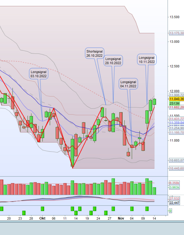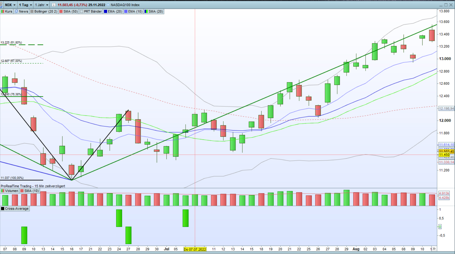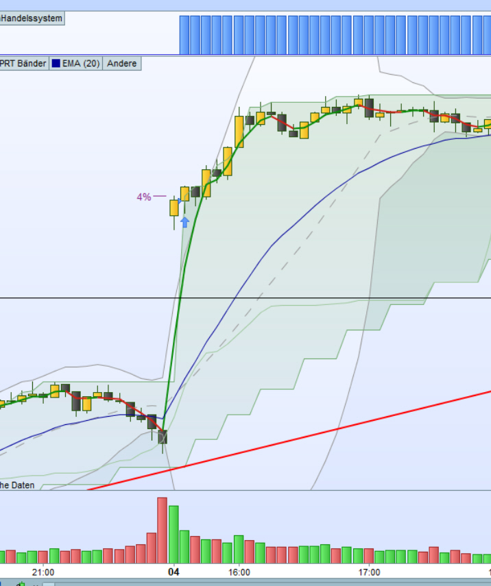 Beispielsweise zeigt der Indikator am 06.07 ein Signal an, welches nicht vollzogen wird (siehe ProBacktest CrossAverage, blau Orange), weil der Kurs erst im Laufe des Handelstages den Stopp erreicht.