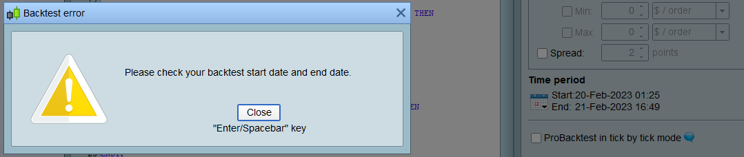 It´s maybe something stupid but when trying to ProbackTest my strategy I get “Please check your ProBackTest start date and end date” no matter which combination of dates I happen to choose.