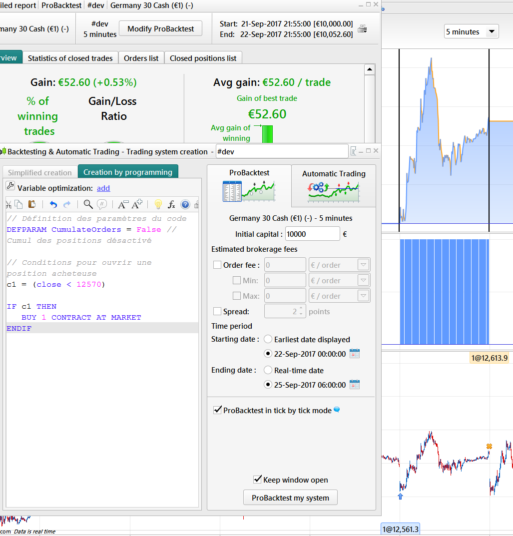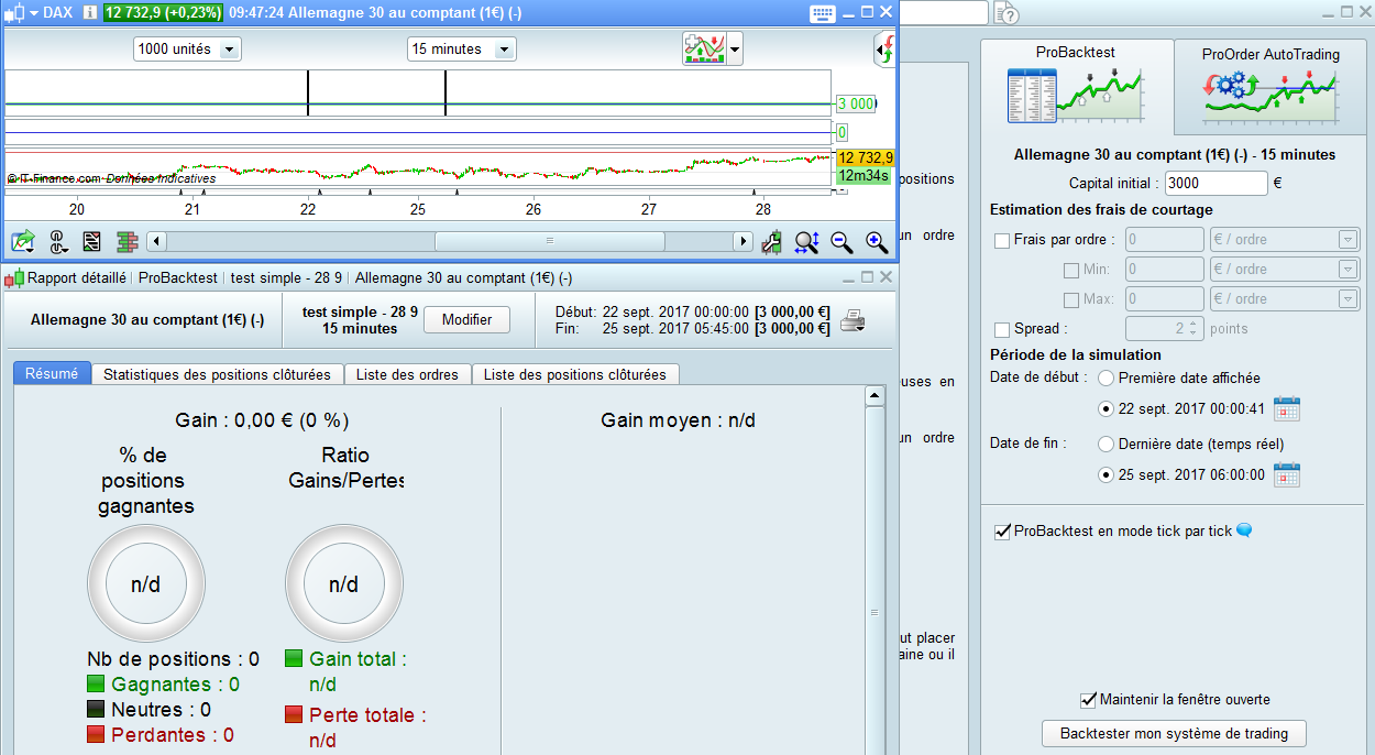 J’ai donc testé un code très simple appliqué au DAX, Contrat mini 1 €, entre le 22 septembre à 00 heure et le 25 septembre à 6 heures.
