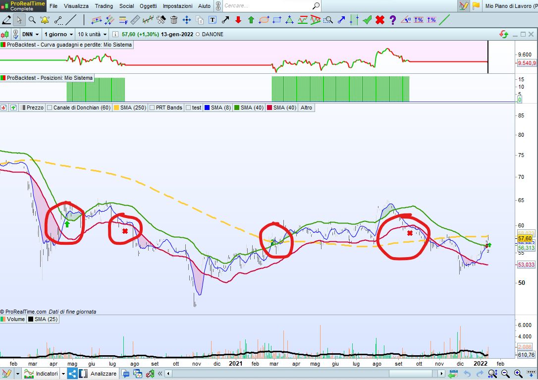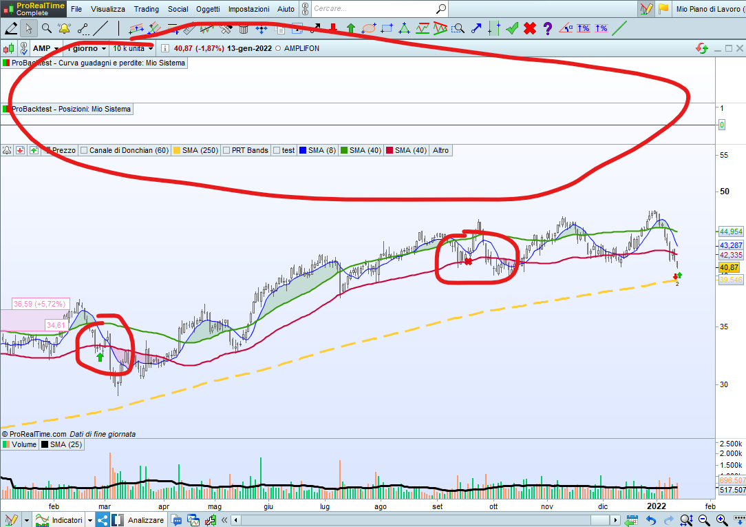 Quando avvio per la prima volta il programma vedo i risultati corretti come si può vedere nella prima immagine ma se vado a selezionare un’altro titolo ho due problemi: non vedo i risultati nella barra in alto e i punti di ingresso e uscita sul grafico sono sbagliati come potete vedere nella seconda immagine.