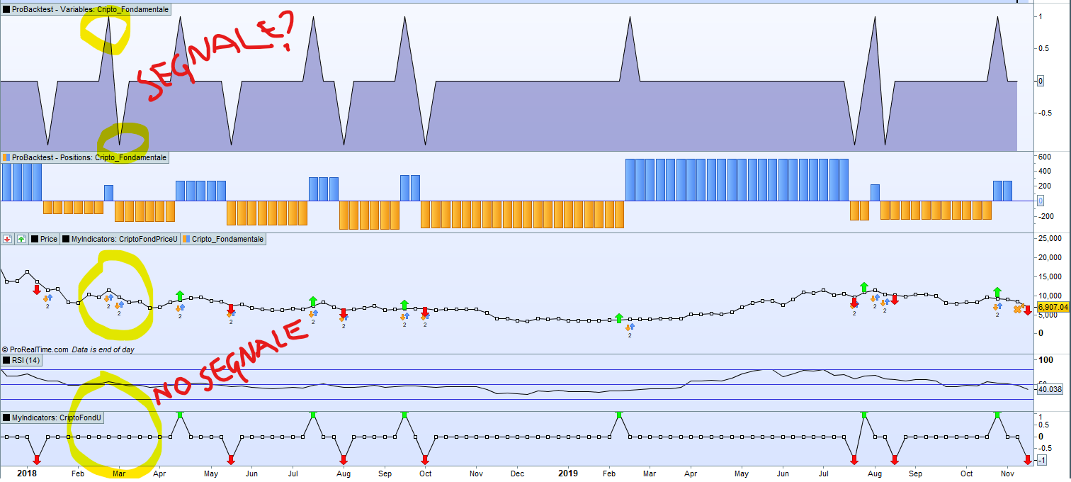 Buonasera a tutti. Ho sviluppato un semplice BackTest sulla base di un indicatore per le criptovalute. Il BackTest compra quando l’indicatore e’ +1 e vende (allo scoperto) quando e’ a -1. In entrambi i casi chiude la posizione precedente prima di invertire. Quando l’indicatore e’ a 0 semplicemente aspetta. Tuttavia mi trovo delle operazioni inaspettate anche quando l’indicatore e’ = 0 (vedi figura allegata). C’e’ un modo per fare il debugging e capire perche’ si producono queste operazioni inattese? Grazie.