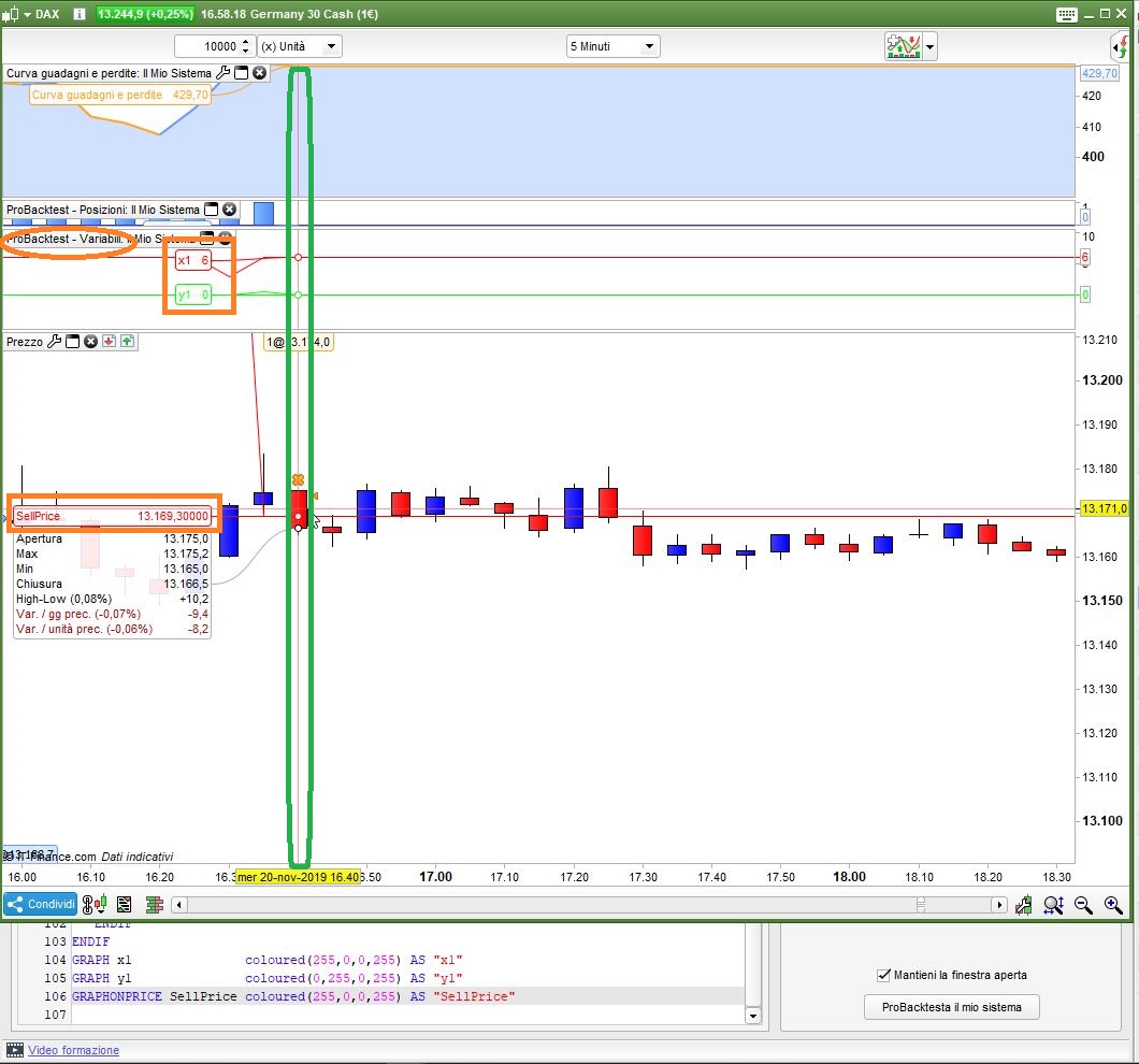 Le variabili utilizzate con GRAPH vengono evidenziate nell’apposita finestra, perché sarebbero fuori scala sui prezzi. GRAPHONPRICE plotta invece le variabili SUL prezzo, purché siano in scala, tipo un prezzo o una media, eccc… Se plotti 1 sul grafico DAX deve rimpicciolirti tutto ad 1/12000esimo per farti vedere sia il prezzo che la variabile, col risultato che sarebbe illeggibile.