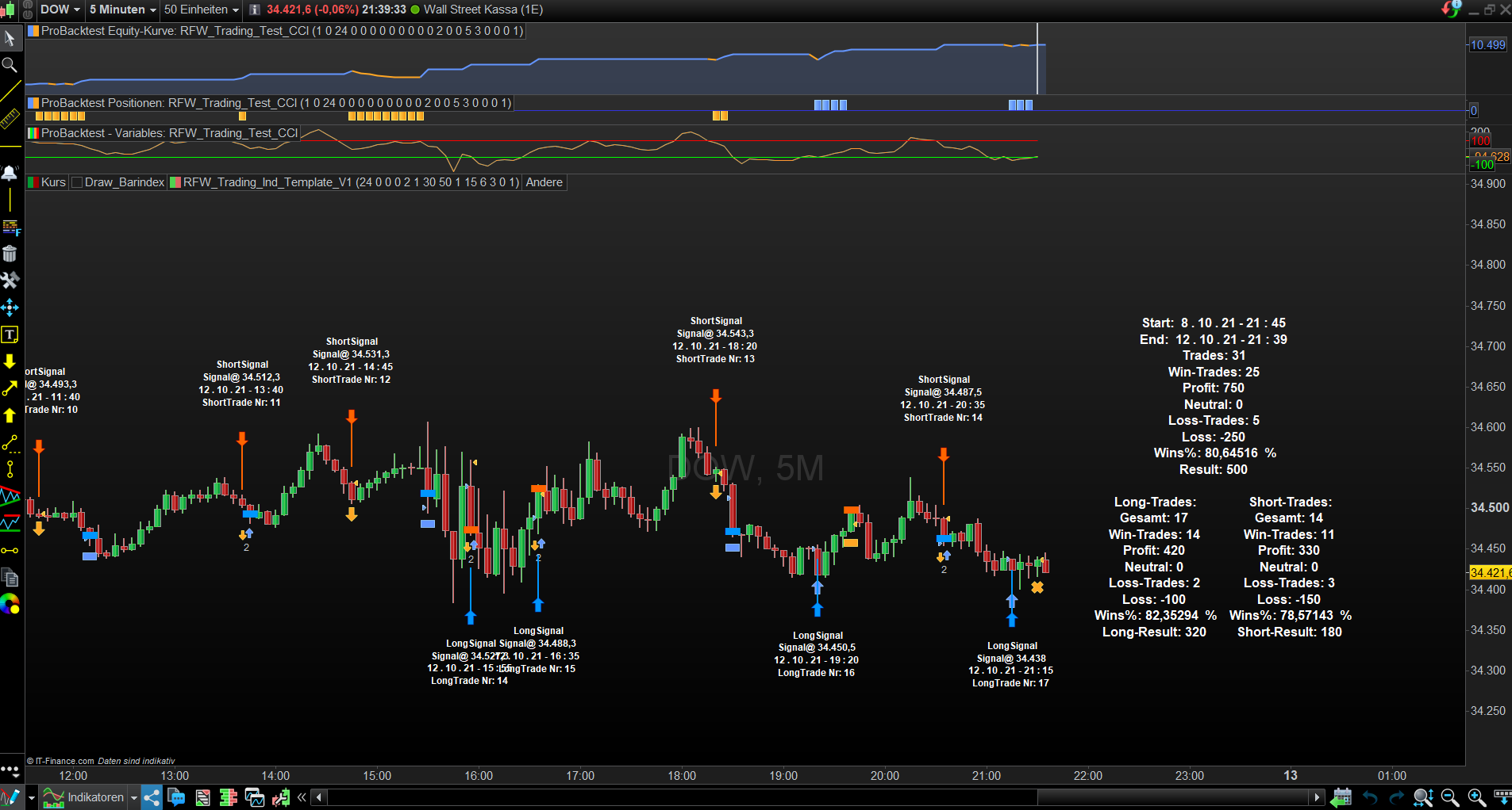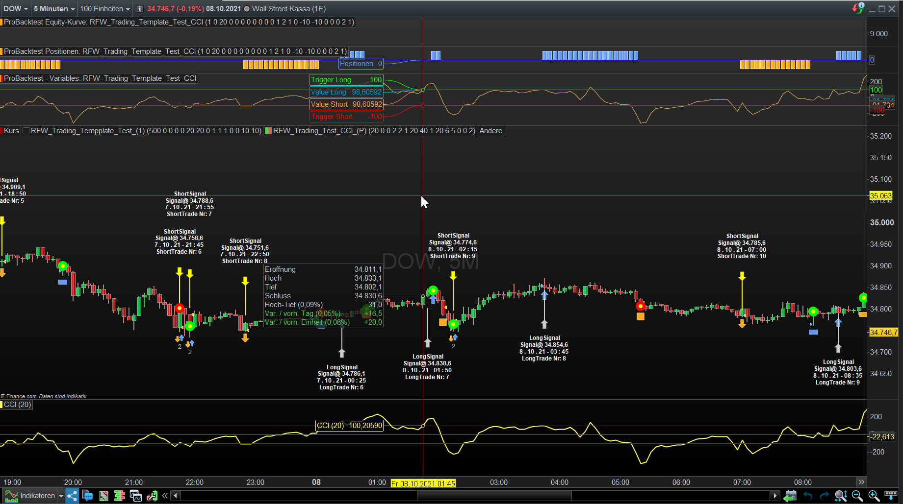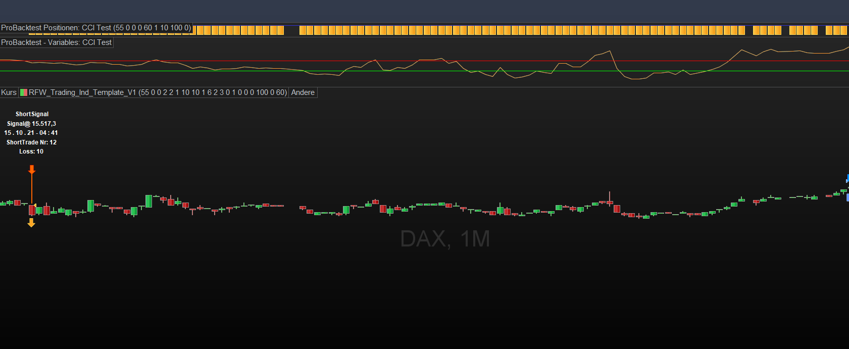 Daneben kommt es gelegentlich zu abweichenden Indikatorenwerten, glücklicherweise jedoch selten. Im Screenshot ersichtlich lt. externem CCI um 1:45 Periode 20 Wert 100,20, in ProBackTest gleiches Setup jedoch 98,60, was zu unterschiedlichen/teils falschen Ergebnissen führt. Vermutlich werden unterschiedliche OHLC-Daten zugrundegelegt?