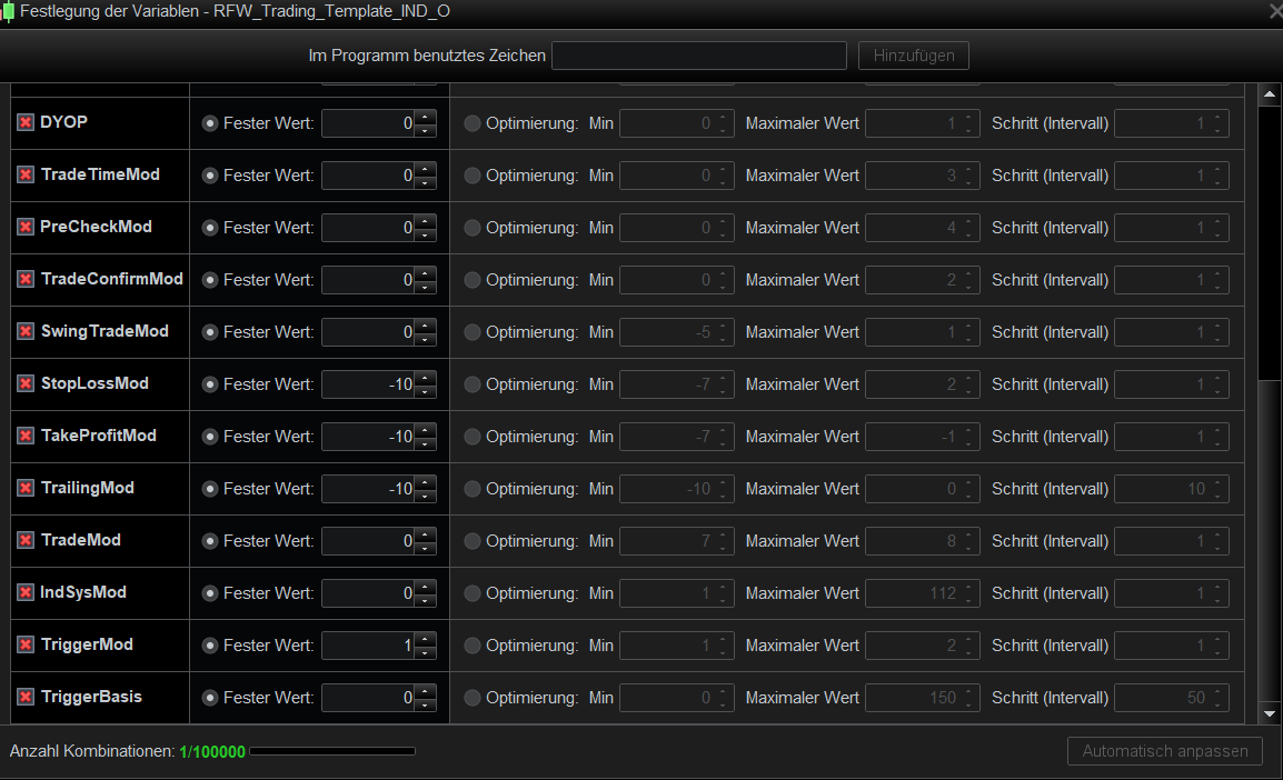 In meinem Fall läuft es wie erwähnt nur dann weiter, wenn ich aus einer Optimierungstabelle starte oder die Variablen lösche und diese fix im Code definiere (siehe weiterer Screenshot).