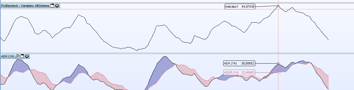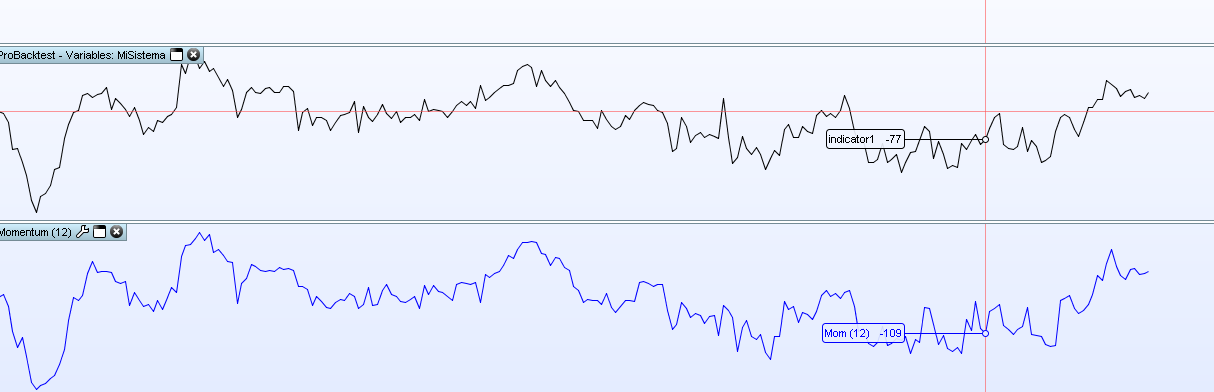 Realmente las gráficas son similares, pero no los valores…. Llevo unas semanas con algo de saturación en cuanto a analizar códigos y ya no veo con claridad si esta siendo realmente un error mío, o esta pasando algo… Me he dado cuenta pq sistemas automáticos que deberían haber mantenido la posición, la cerraban, y “graficando” el indicador directamente en prorealtime estaba en lo cierto, hasta que decidí comprobar con “graph” que valores realmente estaba tomando…