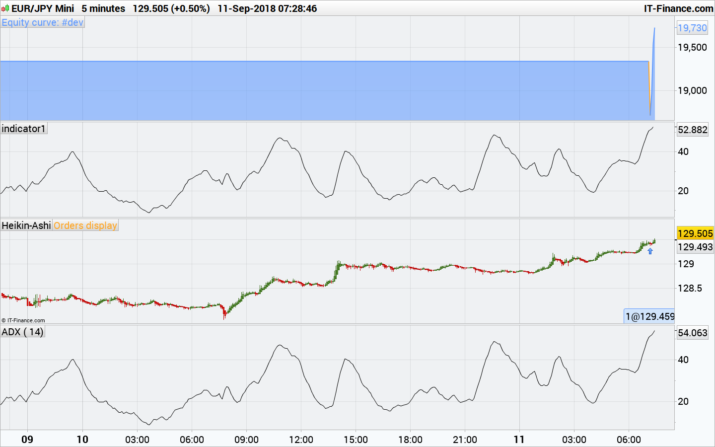 Obtuve exactamente lo mismo en la estrategia (GRAPH) y con el indicador aplicado en el gráfico.