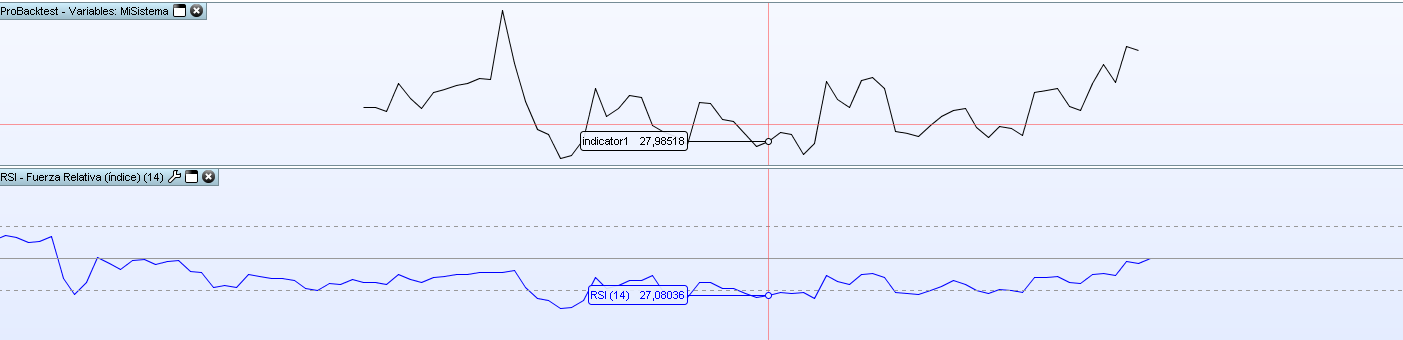 Si vemos los valores de la representación del RSI a través de “graph” son distintos a si vemos el mismo indicador, con mismo periodo y absolutamente todo igual en la representación propia de prorealtime. Si se hace la llamada a un indicador, personalizado o programado por uno mismo, con CALL, sucede exactamente lo mismo. Los resultados son distintos.