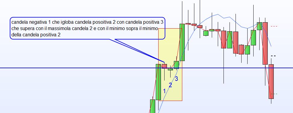In pratica a me serve che il segnale si presenti quando c’è una candela 1 negativa che ingloba la 2 candela positiva è la 3 candela positiva deve avere il massimo dell’ombra superiore al massimo fatto dalla 2 candela e il minimo più alto del minimo fatto sempre dalla 3 candela