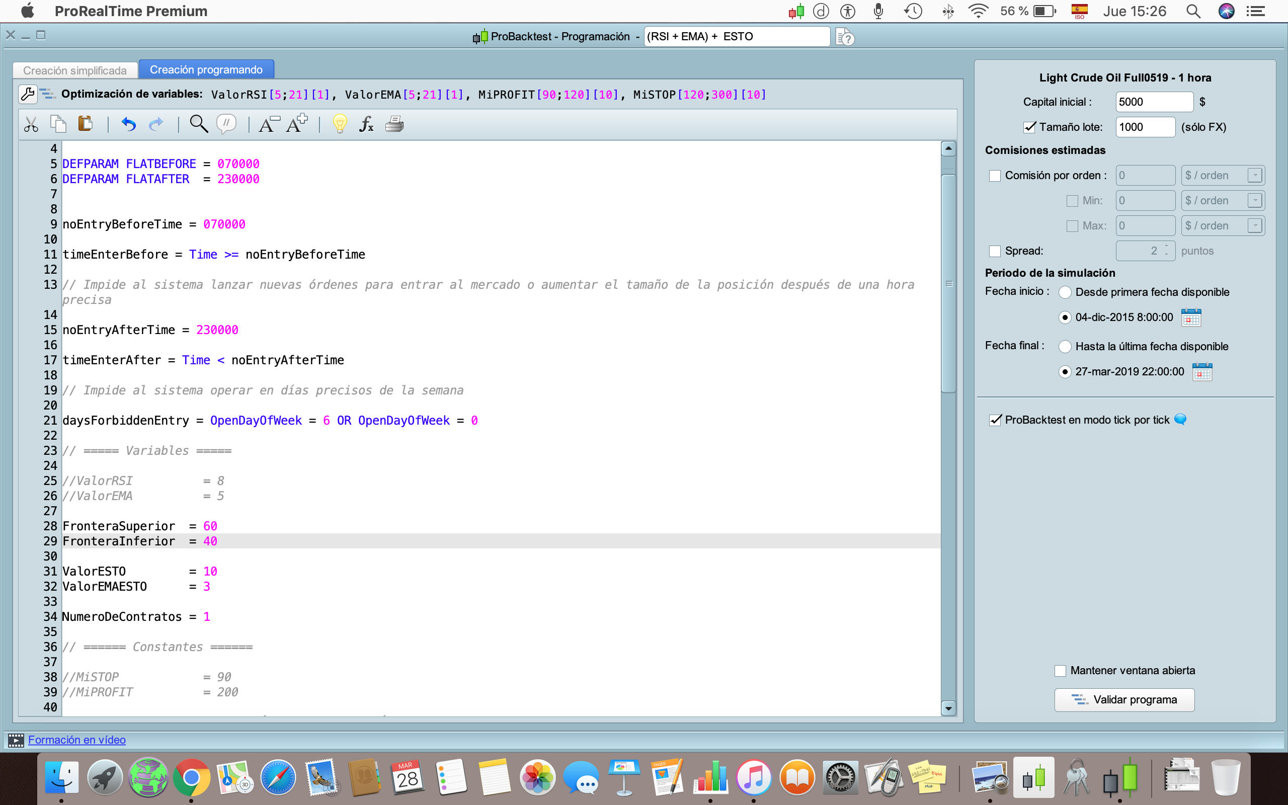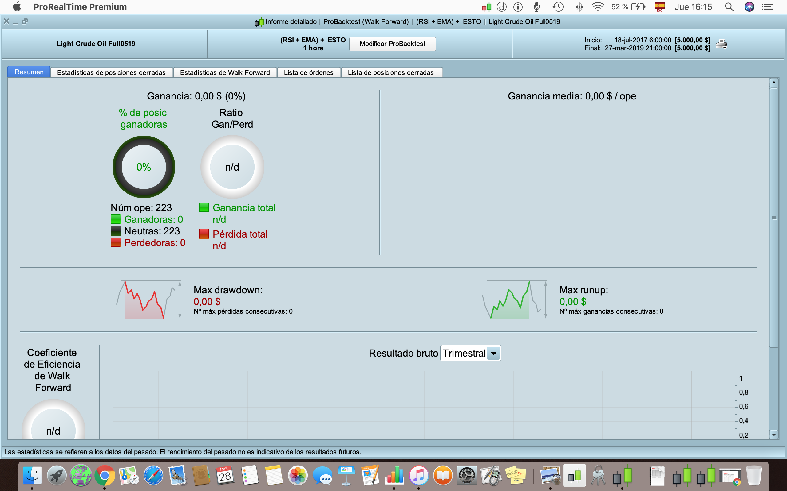 Tengo un problema con el Back Test. Lo ejecuto en una estrategia basada en el RSI. Los ajustes que pongo son: