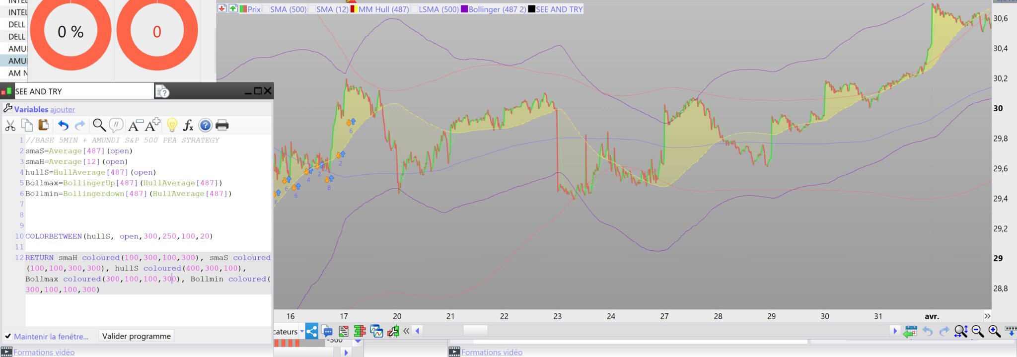 En violet j’ai le bandes de bollinger proposées parmi les indicateurs d’un graphique standard, avec un écart type de 2 et positionné sur une moyenne mobile de Hull [487]