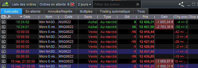 J’ai remarqué une autre erreur en analysant les ordres exécutés, le code qui ne devait prendre que 1 future mini Nasdaq en a pris 2 à un moment donné et pour le micro Nasdaq qui est exactement le même code mais avec 10 contrats micro en a pris 20 (le double prévu par le code) puis 16. (voir capture 2).