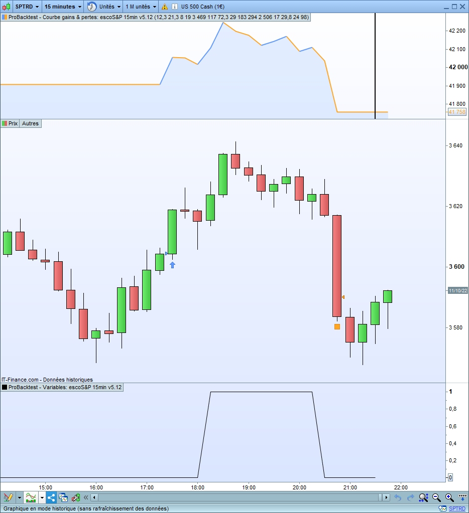 En effet, voici ce qui s’est passé aujourd’hui le 11.10.2022 sur l’indice US 500 (Standard & Poor’s) avec des bougies à 15 minutes, avec le code ci-dessus :