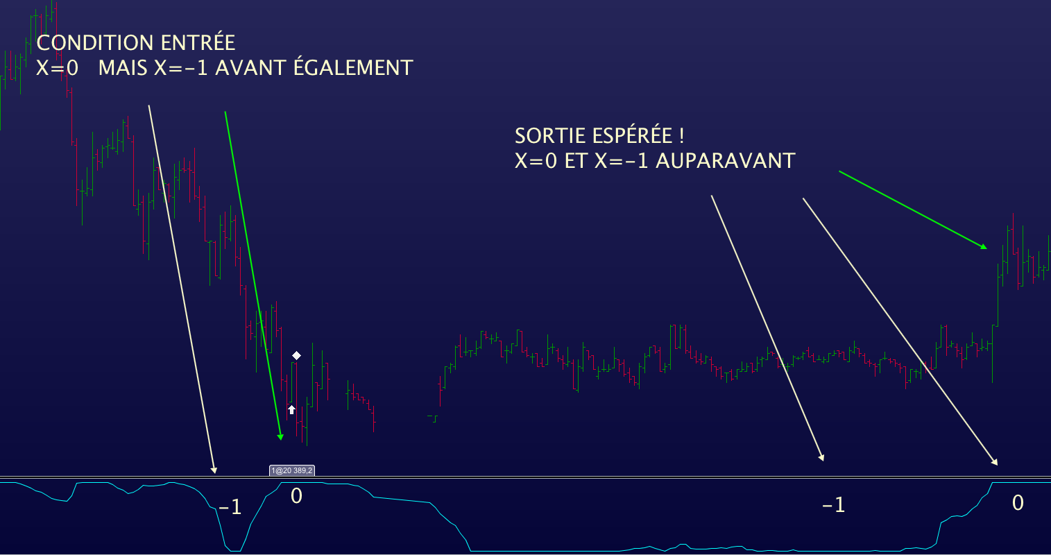 La condition BUY et SELL est la même : X=0 ; la seule différence est que la condition SELL exige en plus que X aie été =-1 depuis le BUY.