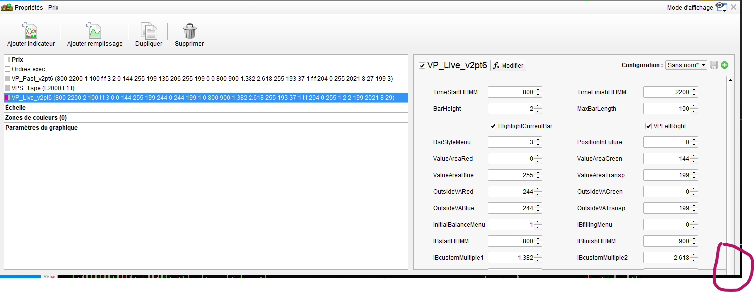 Le menu déroulant (fenêtre de droite) fait apparaitre les variables, les premières lignes de l’indicateur mais impossible de dérouler, de visualiser et donc de sélectionner/désélectionner les dernières lignes.