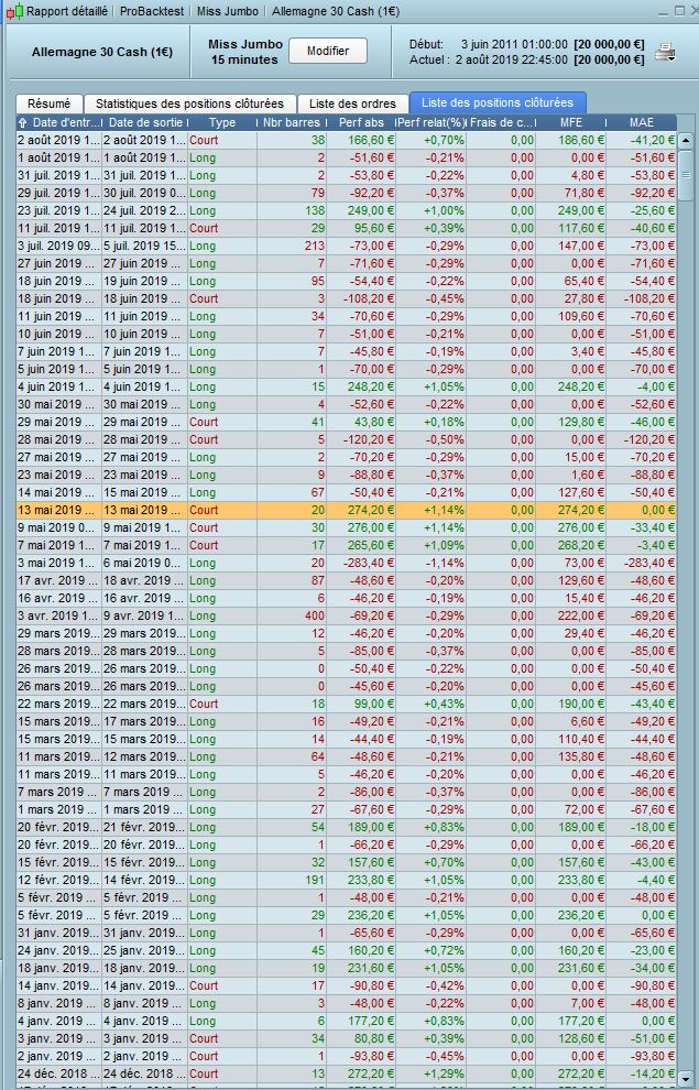 J’utilise régulièrement la fonctionnalité backtest d’une version Premium de PRT pour tester des stratégies sur le Dax dont certaines sont en production. Et j’aime bien tester sur l’ensemble de la durée disponible, à savoir 8 ans et 2 mois, même si le fait que cette limite fait glisser la période étudiée. En faisant des backtests ce matin, j’observe des phénomènes curieux. A savoir des stratégies qui en backtest sur l’Allemagne 30 cash 1€ du 1er juin 2011 à aujourd’hui, génère au bout d’un certain temps des résultats très dissemblables de ceux précédemment observés. Un backtest 2011-2019 faisant apparaître du rouge pour l’année 2019 alors que cette stratégie est verte depuis le début de l’année, je me suis aperçu que si je backtestais 2019 seule, le backtest respecte la réalité observée, alors que si je backtest 2011-2019, 2019 devient rouge car, en observant la liste des positions clôturées, je m’aperçois que pour cette année-là sur la période allant du 2 janvier au 3 mai, pendant le marché haussier, tous les longs observés dans la réalité, sont transformés en backtest en shorts, et vice versa! Je regarde d’autres stratégies qui en backtest ont vu leur année 2018 devenir rouge, même phénomène, des ordres en backtest 2011-2019 inversés sur une partie de l’année 2018 alors que le backtest sur la seule année 2018 est correct. Le nombre de trades est aussi augmenté. C’est comme si le fait de backtester sur 98 mois faisait que la plateforme de backtest perde un peu les pédales au bout d’un certain nombre d’années, en inversant les conditions d’entrée en position. Je n’avais jamais observé ce problème auparavant, quelqu’un sait-il si PRT mène actuellement des actions qui pourraient expliquer ces phénomènes?