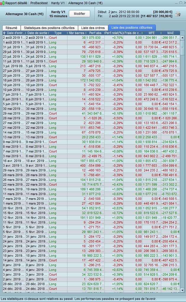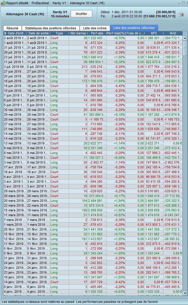 derniers trades de la période décembre 2011 – août 2019 avec des longs qui deviennent des shorts par exemple à compter du 28 mars 2019