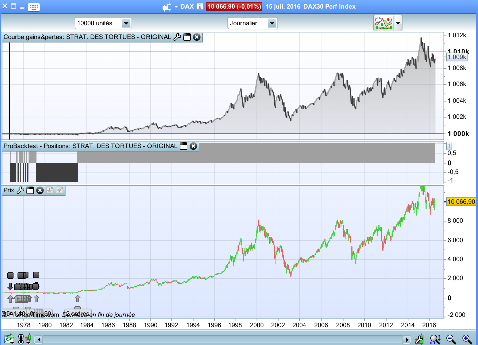 Sur la capture d’écran (DAX index, juste pour l’essai, alors que les tortues ne tardaient pas directement le Dax), on voit clairement que la dernière position “long” est maintenue bien plus qu’elle ne le devrait. On devrait sortir sur le plus bas des 10 dernières bougies.
