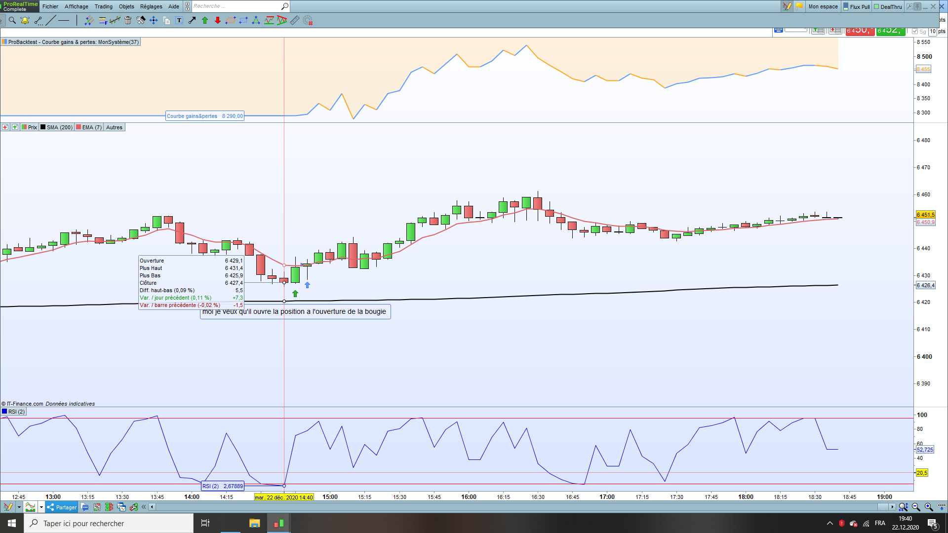 bonjour, j’ai un petit problème dans ma stratégie enfaite ma possition ouvre en achat quand le rsi 2 période croise a la hausse la ligne 5 et que le prix sois au-dessus de ma mm 200 période mais le seule souci que j’ais c’est que mon trade ouvre quand la bougie de signal est cloturer se que j’aimerais c’est que ma position sois prise a l’ouverte de la bougie. je vous demande car je ne sais pas si il y a un code pour programmer cela. je vous montre tous ça sur la photo en-dessous. car j’ai le take profit qui est basé sur la mm 10.