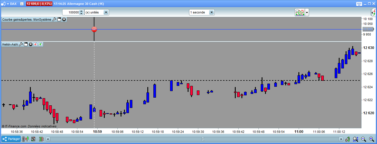 Ce programme tourne sur le DAX à 1 seconde et dans la Période de la simulation, j’ai mis comme Date de début : 19 juin à 10:59:00.