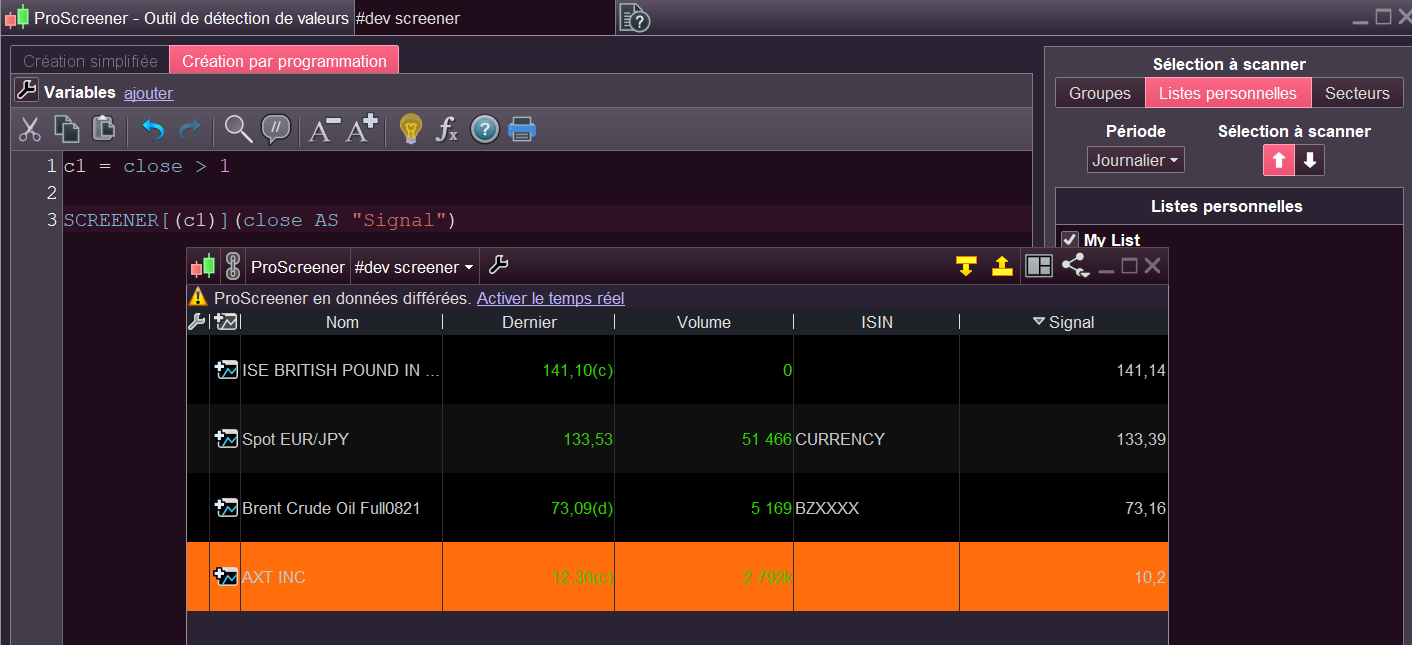 j’ai rajouté ce titre dans une liste dediée (seulement lui), et j’ai fait un screener basique :
