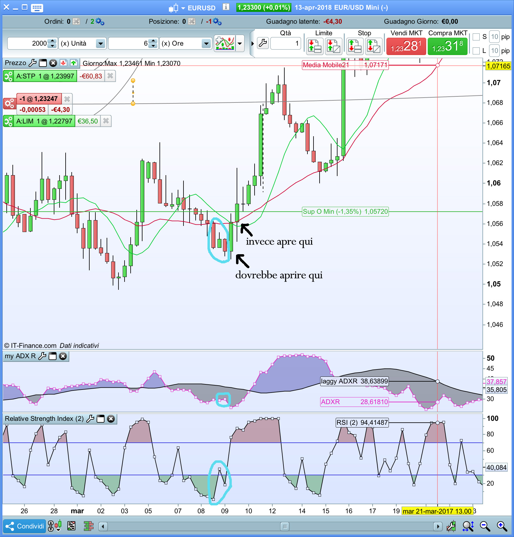 Le ultime tre candele devono essere rispettivamente: la terzultima ribassista, la penultima rialzista, l’ultima di nuovo ribassista e che chiuda al di sotto della terzultima. Se poi si verifica anche una divergenza tra RSI e prezzi (sull’ultima candela), si prospetta una inversione (ipotesi al rialzo), l’ADXR lo conferma se è in crescita per l’ultima candela. VEDI jpg allegata.