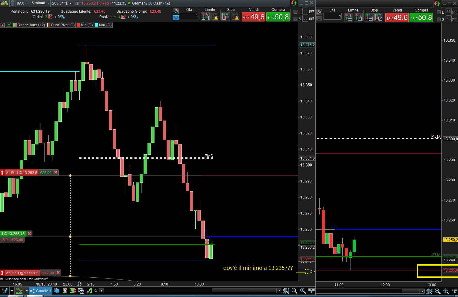 Richiamando 4 tick il margine di errore sui prezzi è più evidente, infatti il minimo di oggi me lo segna sul GER30 me lo segna a 13.235,20