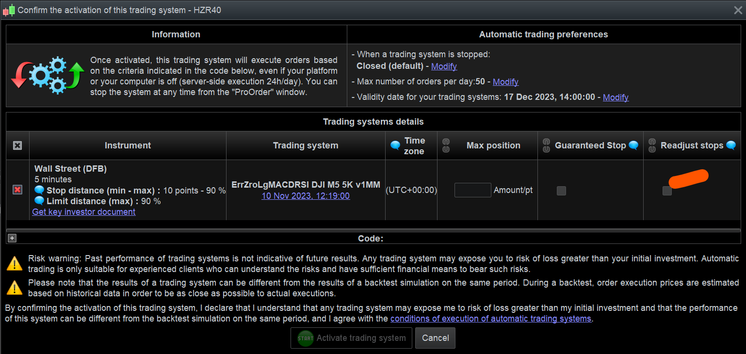 For another topic and another day : I more and more start to see or feel that it is a plain PRT error, and not an IG thing. Why ? well, because the position never even opens, the mentioned price (-distance) never makes sense (like 100+ points for Nasdaq), and it occurs with systems with a Stop Loss command in them only. Regarding to this I also see a relation to that other checkbox (about the guaranteed stop we need to pay for), which is something which is arranged for in advance of the trade. I never ticked that one, but al least that literally relates to the Stop Loss command and how something needs to be registered at IG so the extra money can be charged.