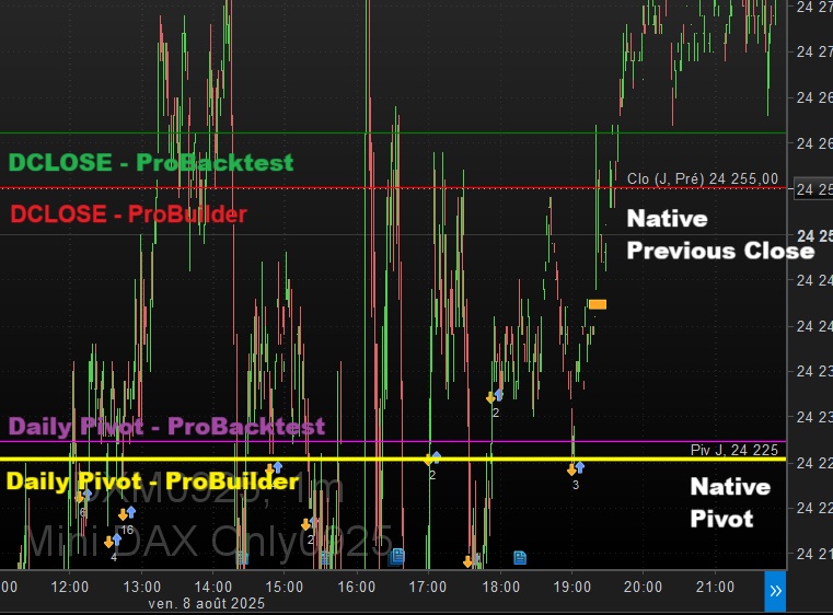 You add a bunch of GRAPHONPRICE statements, and that reveals that the ProBacktest Pivot levels are different from the ProBuilder Pivot levels. The last ones being identical to the native pivot levels. What the heck, same code, different calculation result. Zooming in a bit further, you find that the ProBacktest DCLOSE differs from the ProBuilder DCLOSE. Took me some time, but for the DAX it appeared that DCLOSE retrieves the 22h00 price when used in ProBacktest.